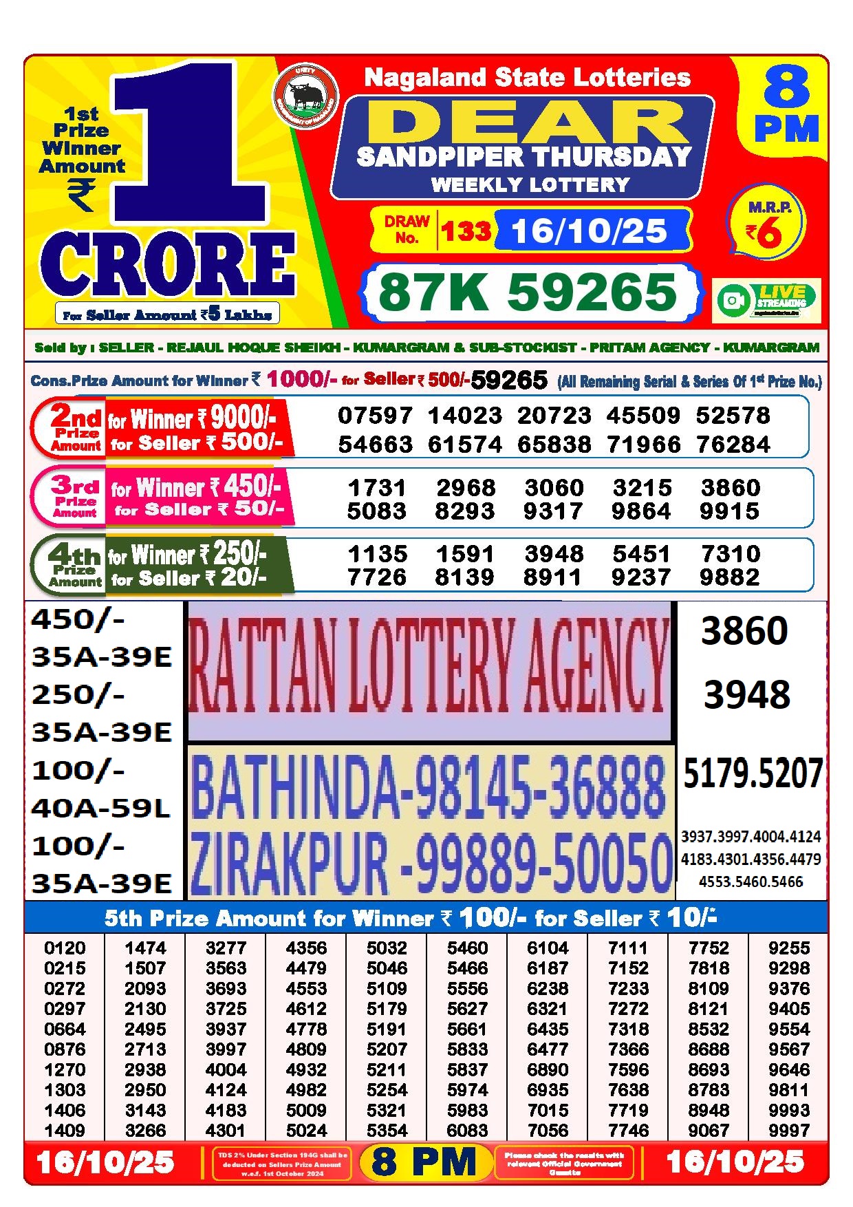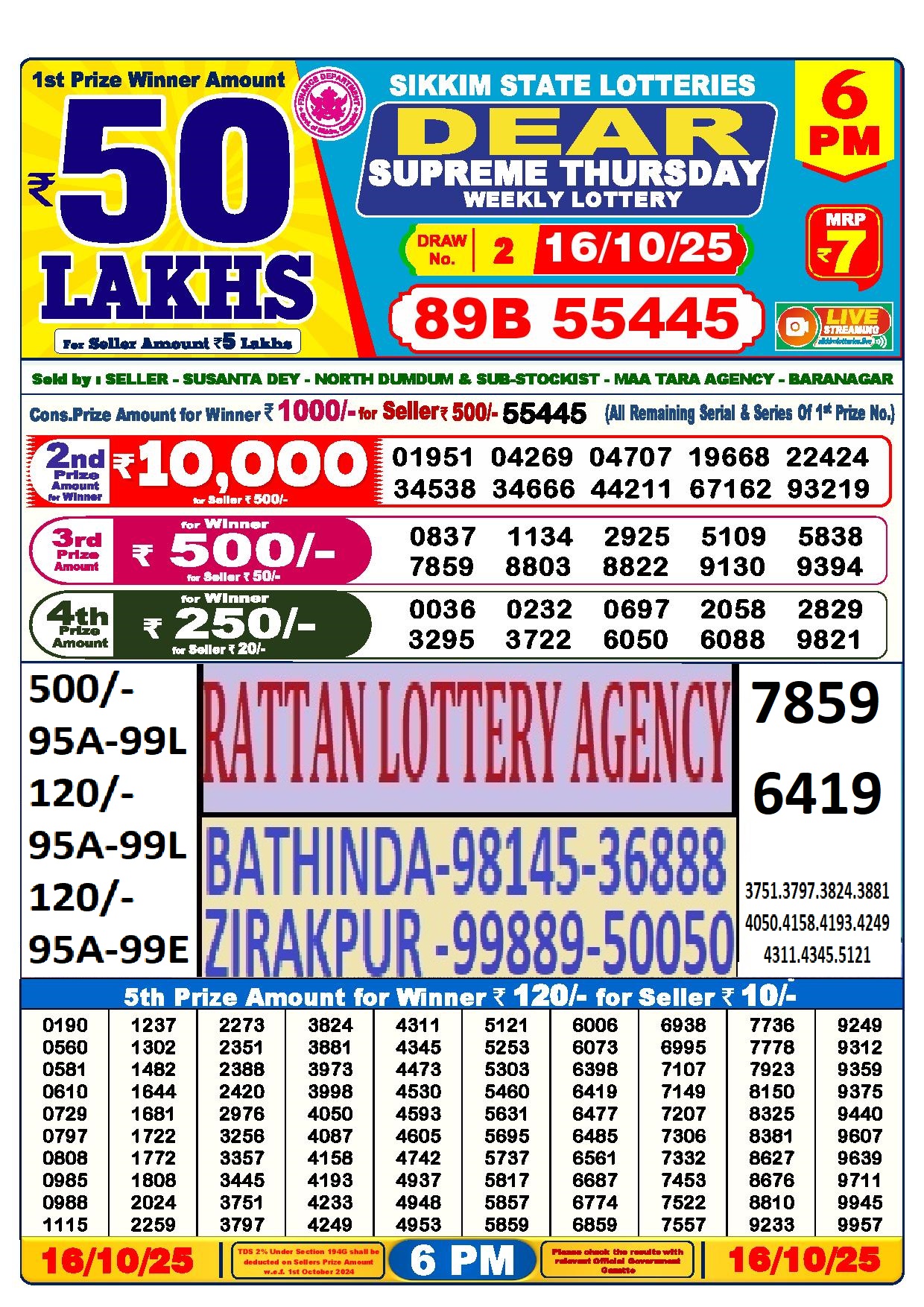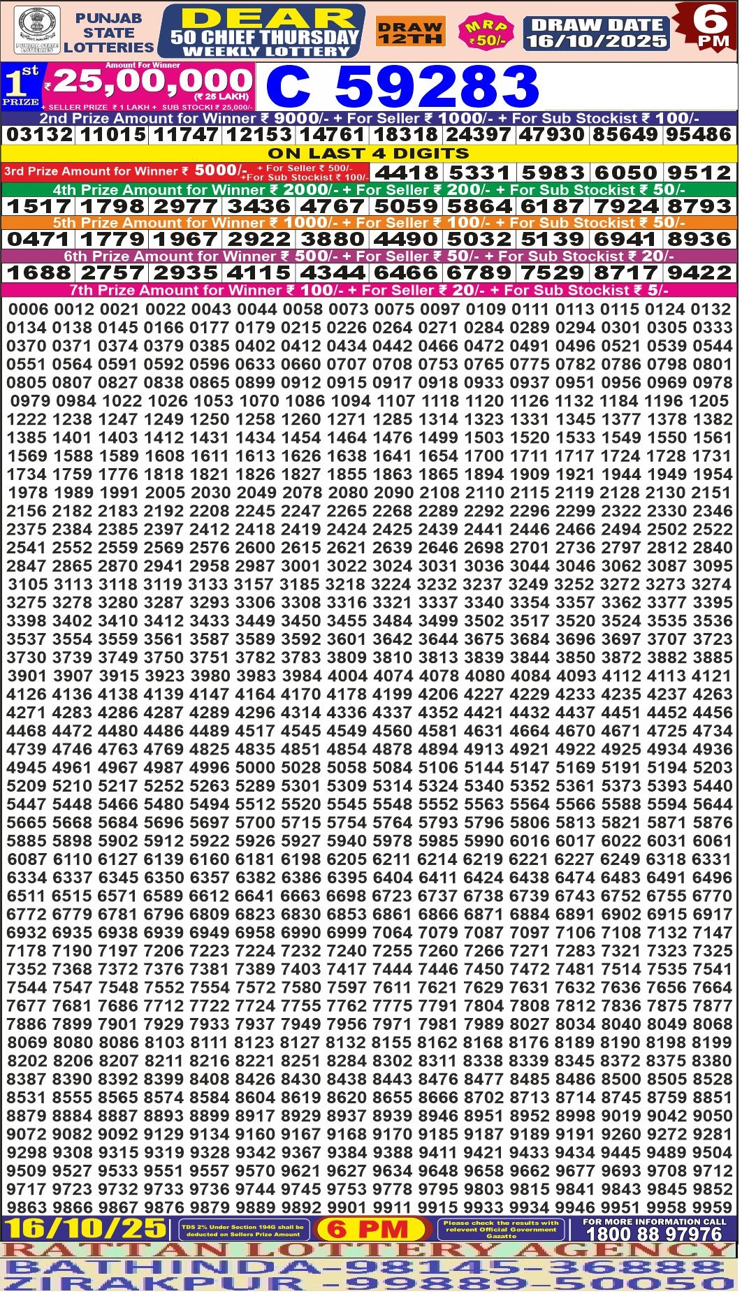 RESULT DEAR 50 CHIEF THURSDAY WEEKLY LOTTERY 16.10.2025