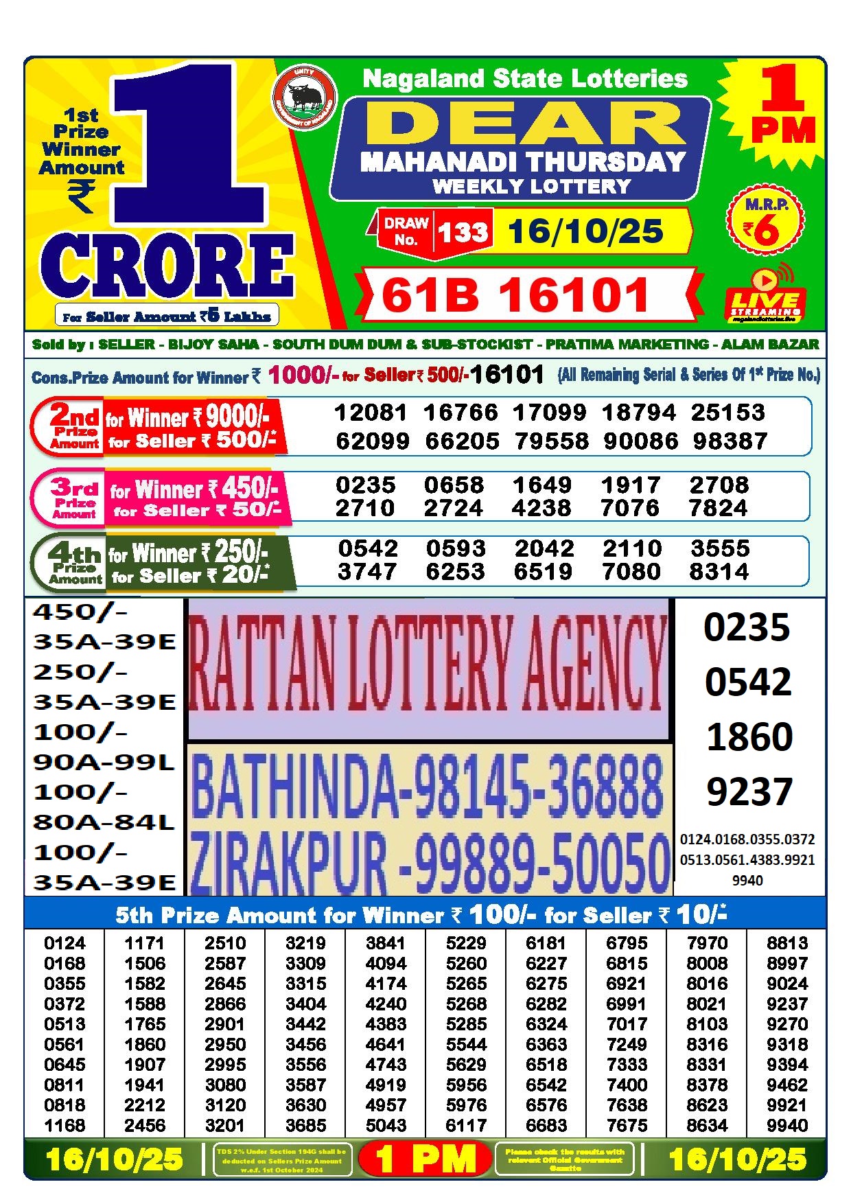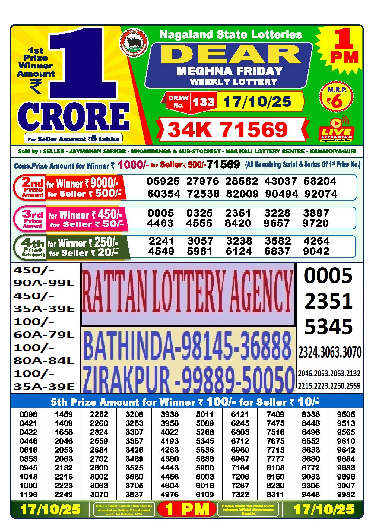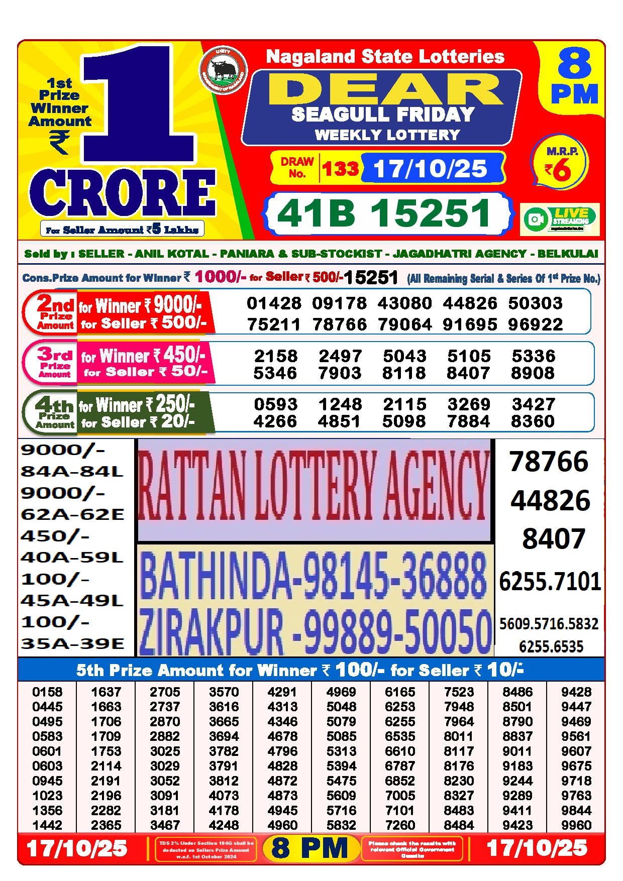 RESULT DEAR 50 CHIEF THURSDAY WEEKLY LOTTERY 16.10.2025