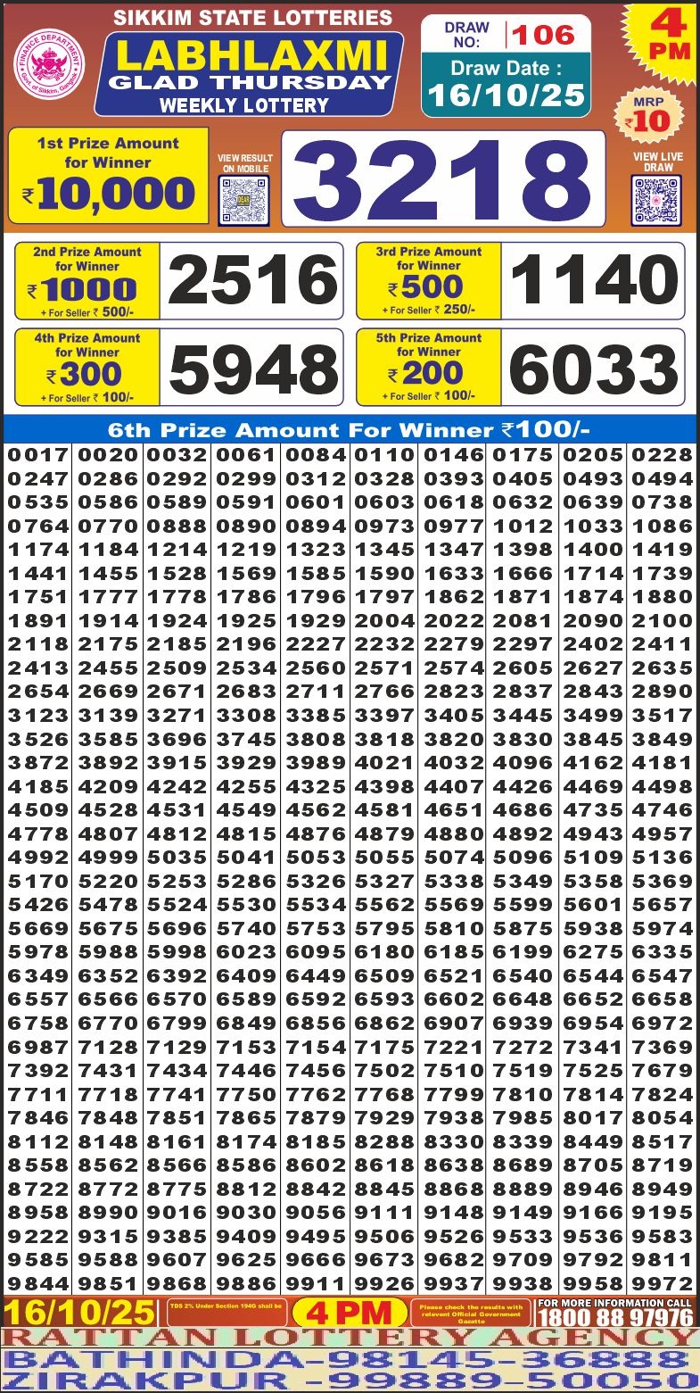 RESULT LABHLAXMI GLAD THURSDAY WEEKLY LOTTERY 16.10.2025