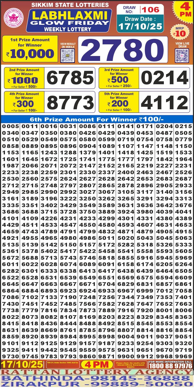RESULT LABHLAXMI GLOW FRIDAY WEEKLY LOTTERY 17.10.2025