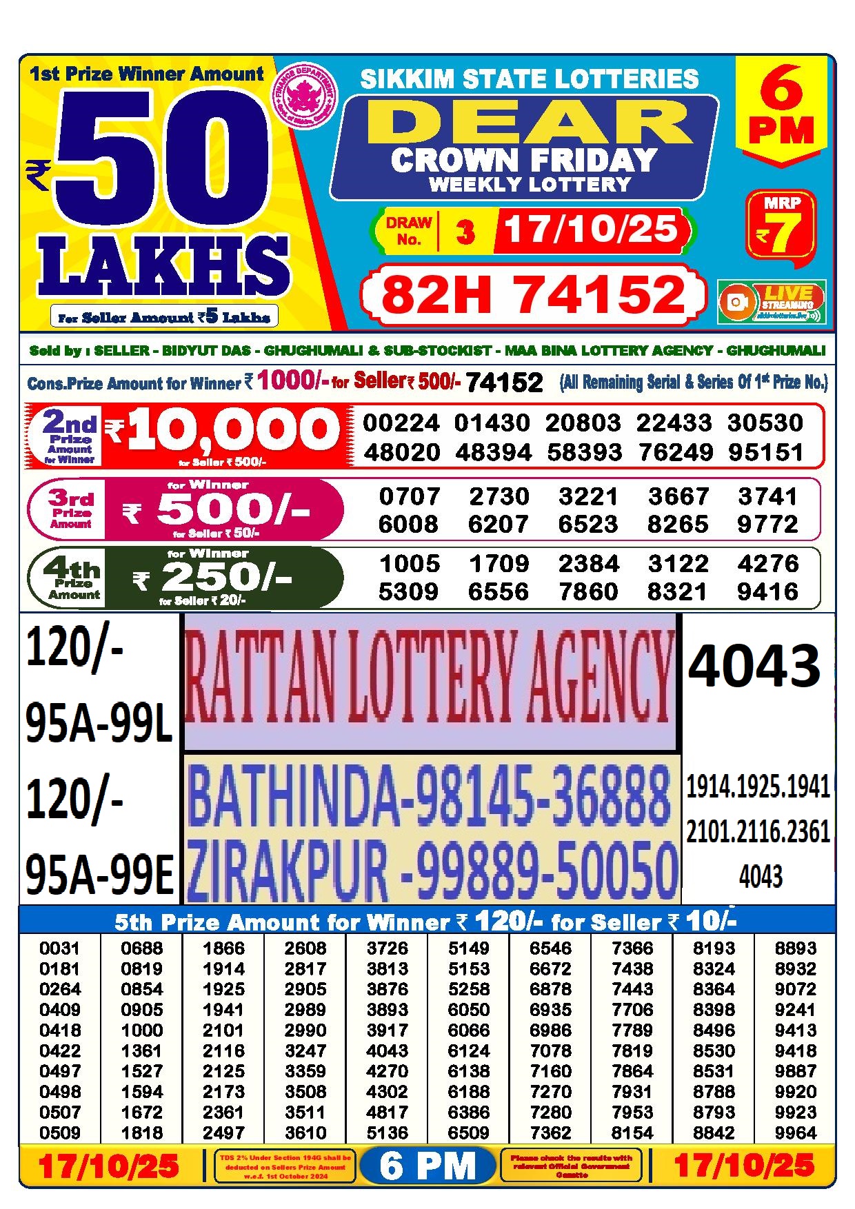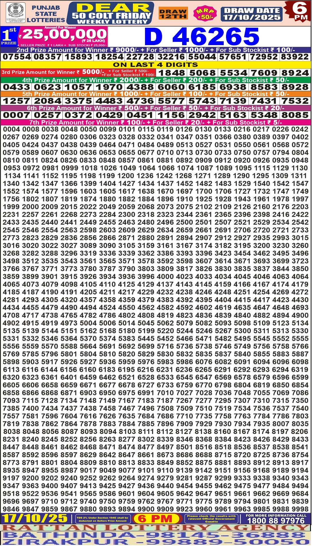 RESULT PUNJAB STATE DEAR 50 COLT FRIDAY WEEKLY LOTTERY 17.10.2025