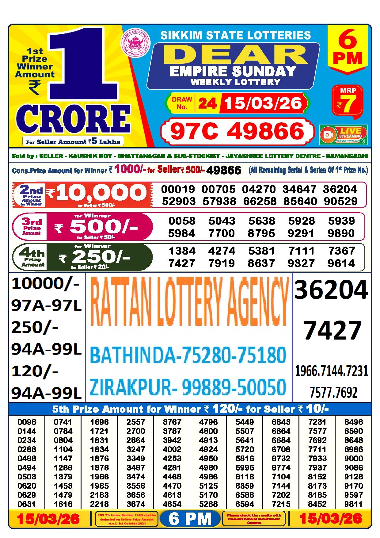 RESULT DEAR 50 RANGER SUNDAY WEEKLY LOTTERY 15.03.2026