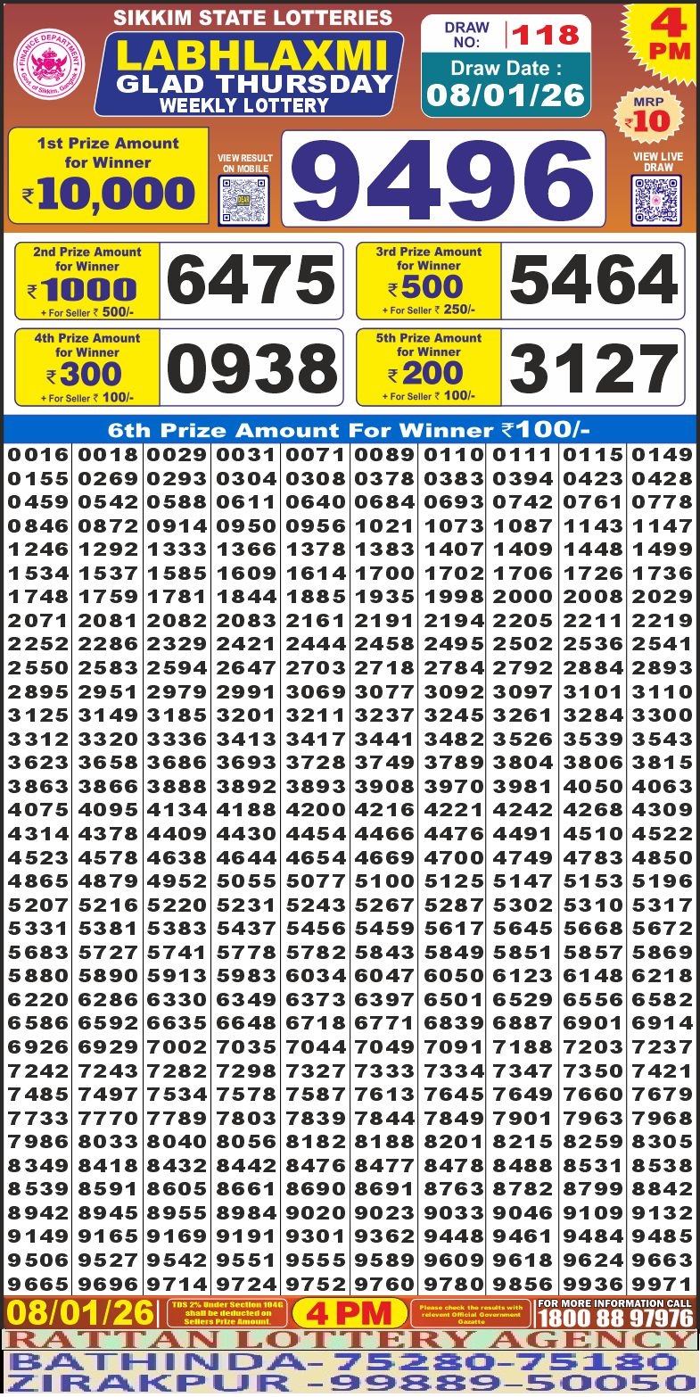 RESULT LABHLAXMI GLAD THURSDAY WEEKLY LOTTERY 08.01.2026