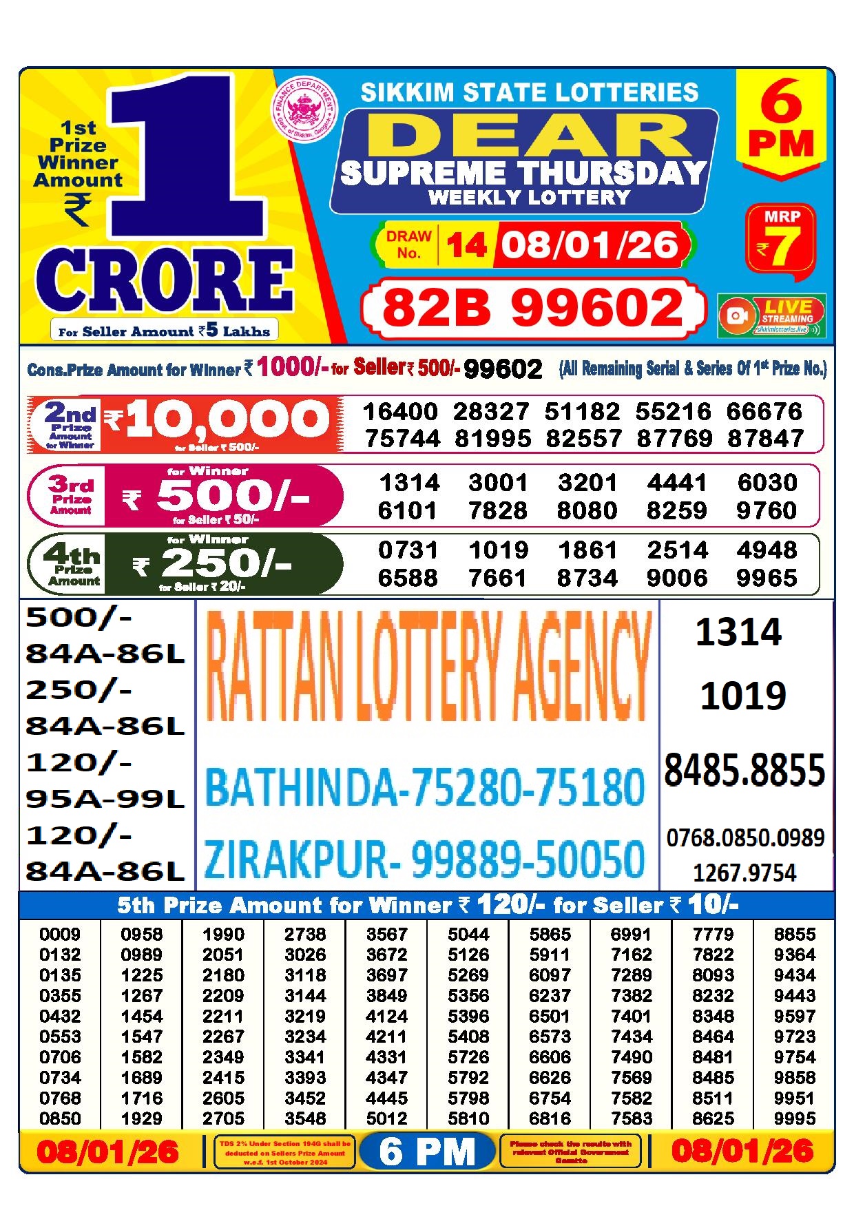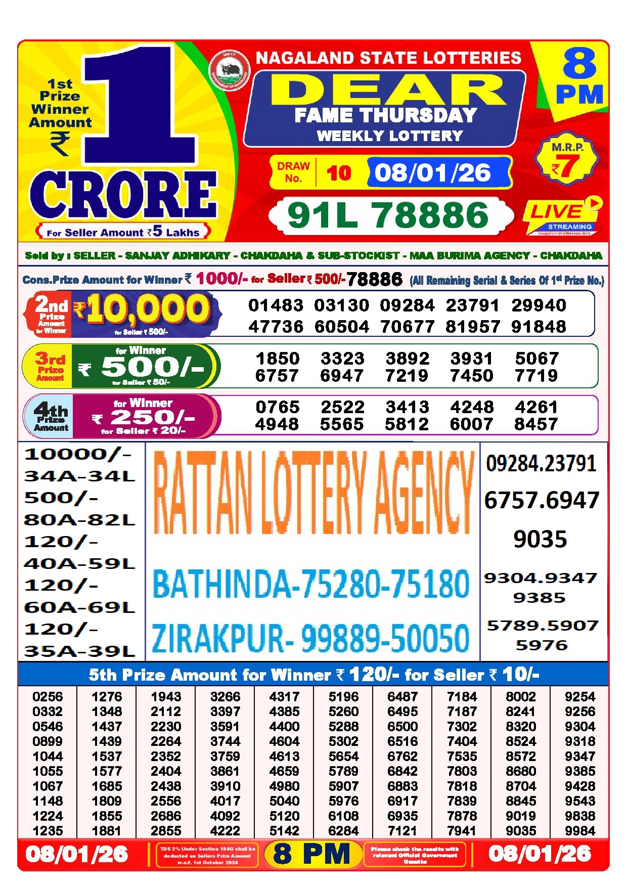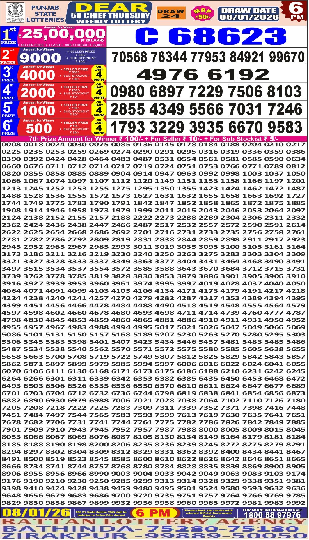RESULT DEAR 50 CHIEF THURSDAY WEEKLY LOTTERY 08.01.2026