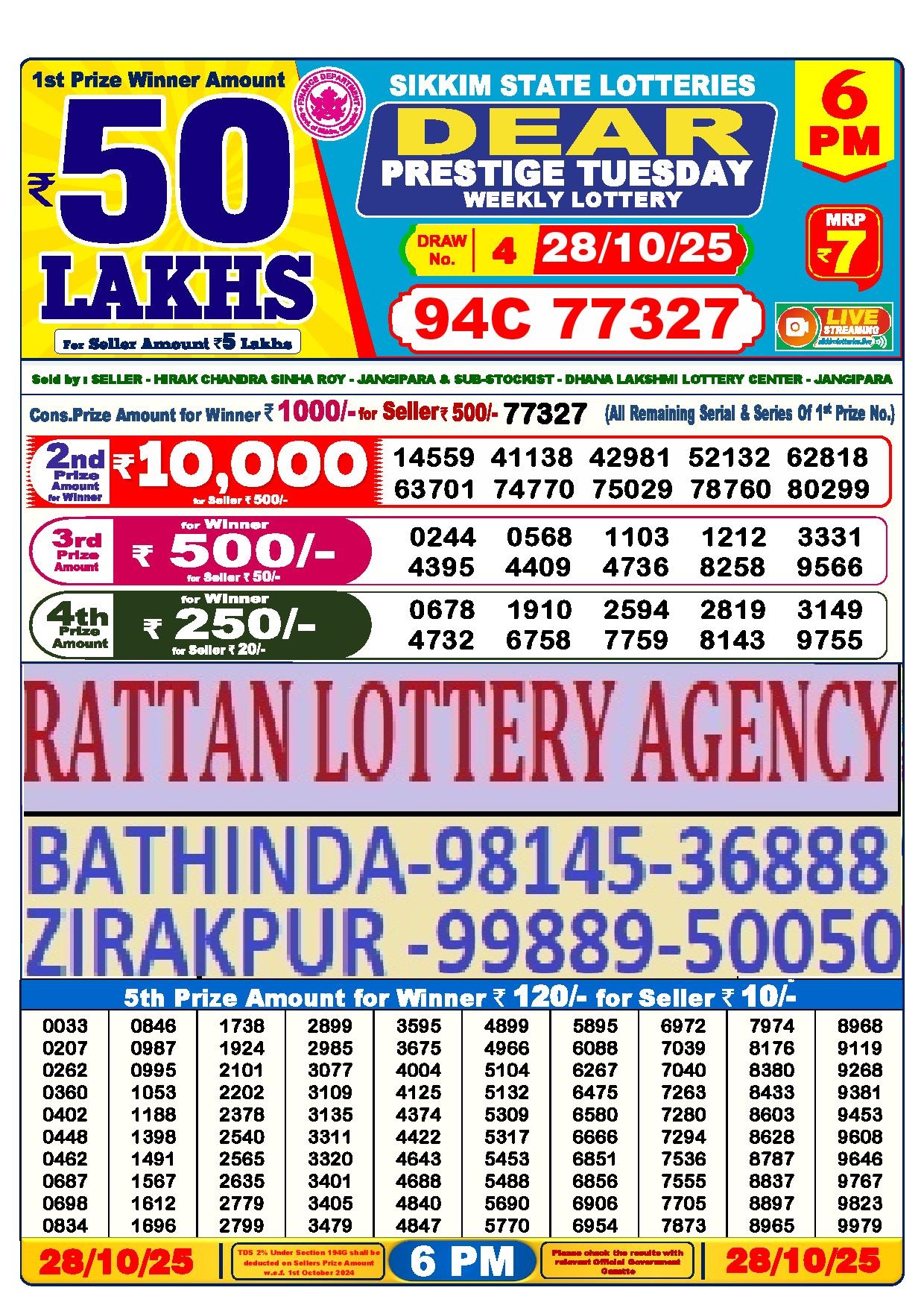 RESULT DEAR 50 BRONCO TUESDAY WEEKLY LOTTERY 28.10.2025