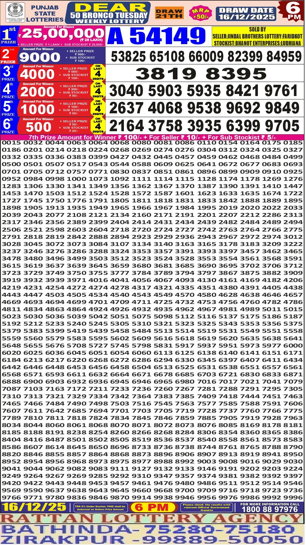 RESULT DEAR 50 BRONCO TUESDAY WEEKLY LOTTERY 16.12.2025