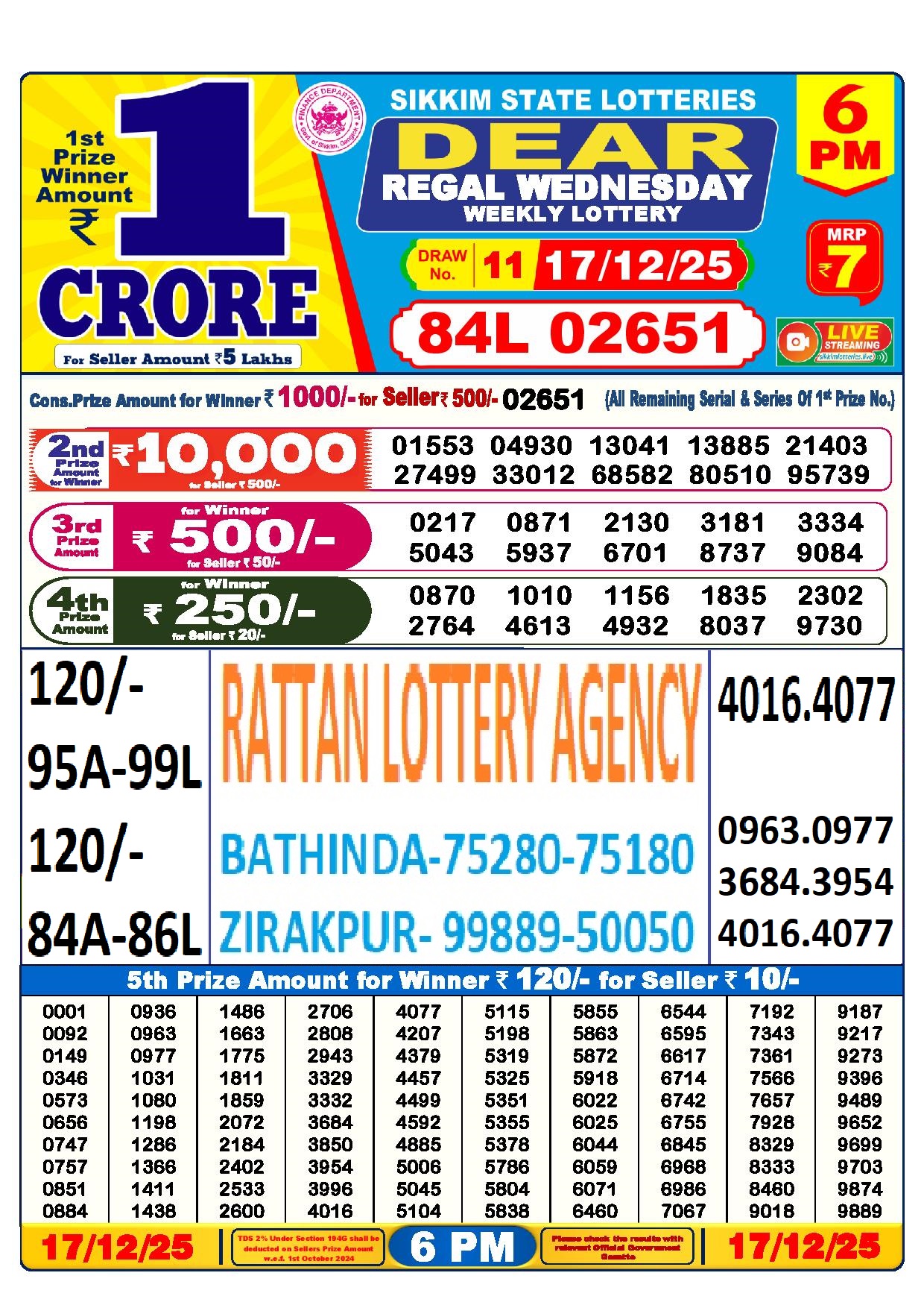 RESULT DEAR DELIGHT WEDNESDAY WEEKLY LOTTERY 17.12.2025