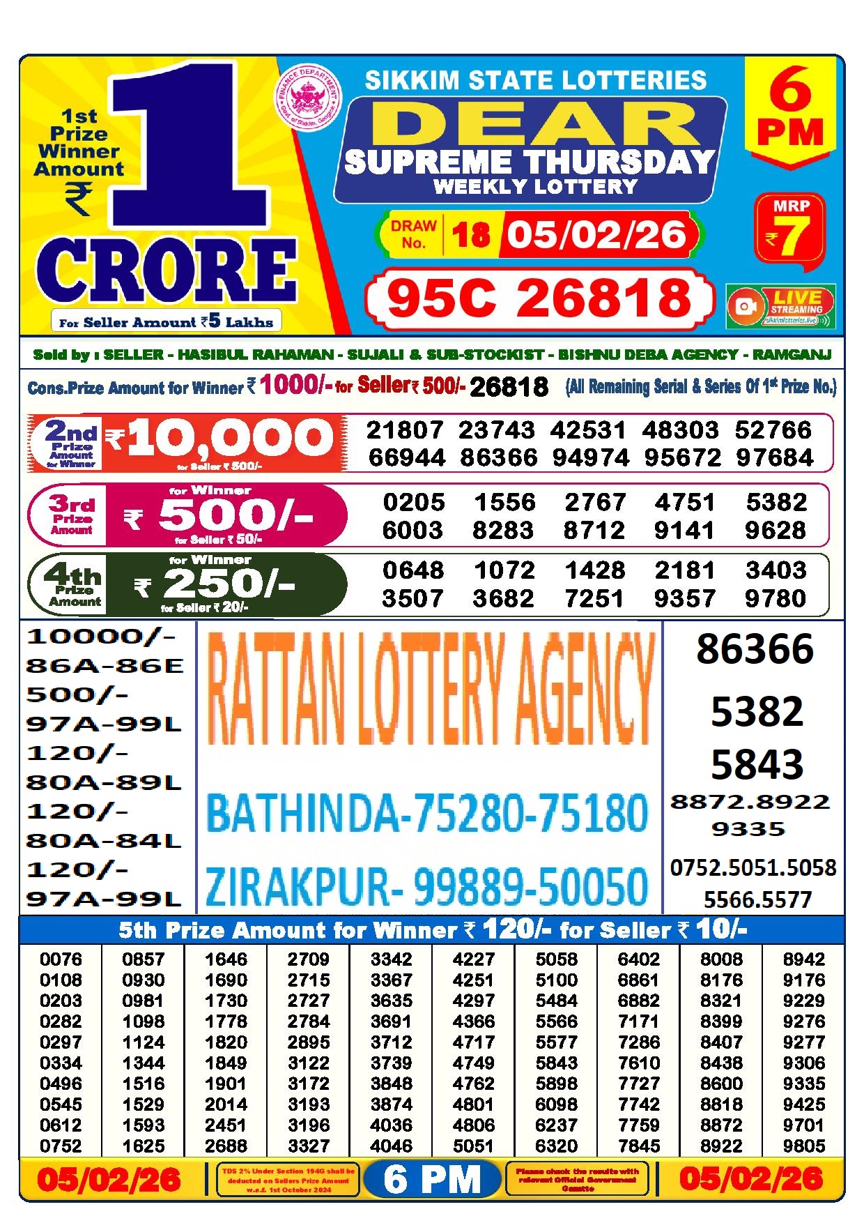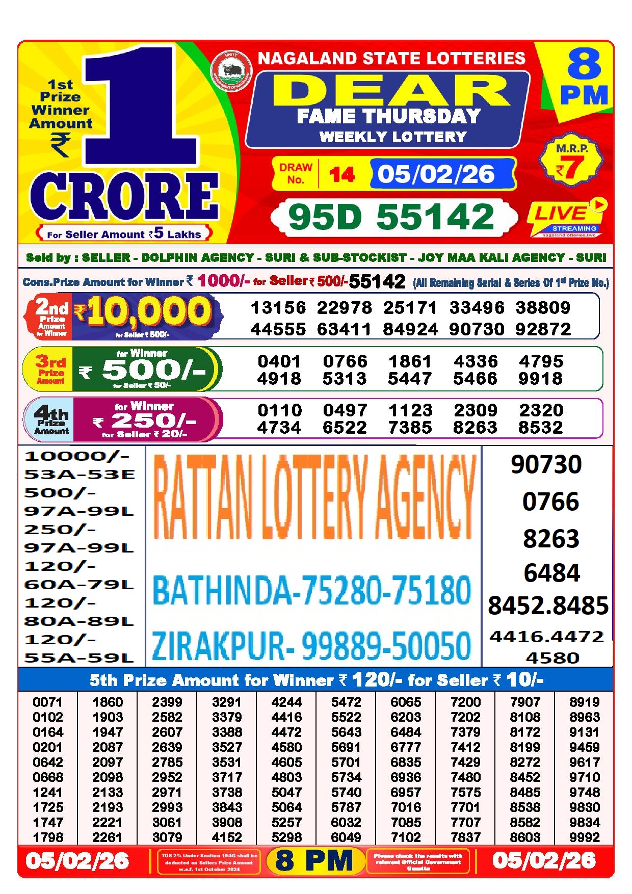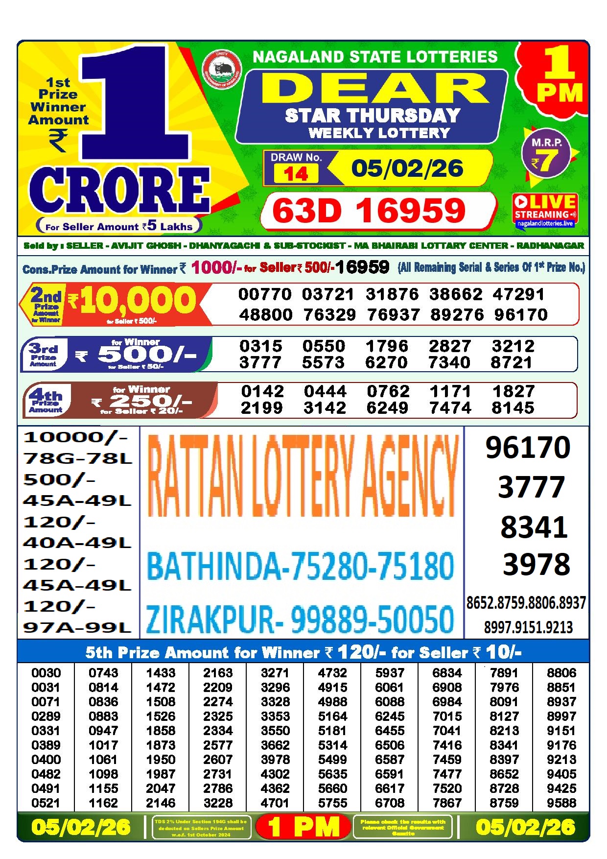 RESULT DEAR 50 CHIEF THURSDAY WEEKLY LOTTERY 05.02.2026