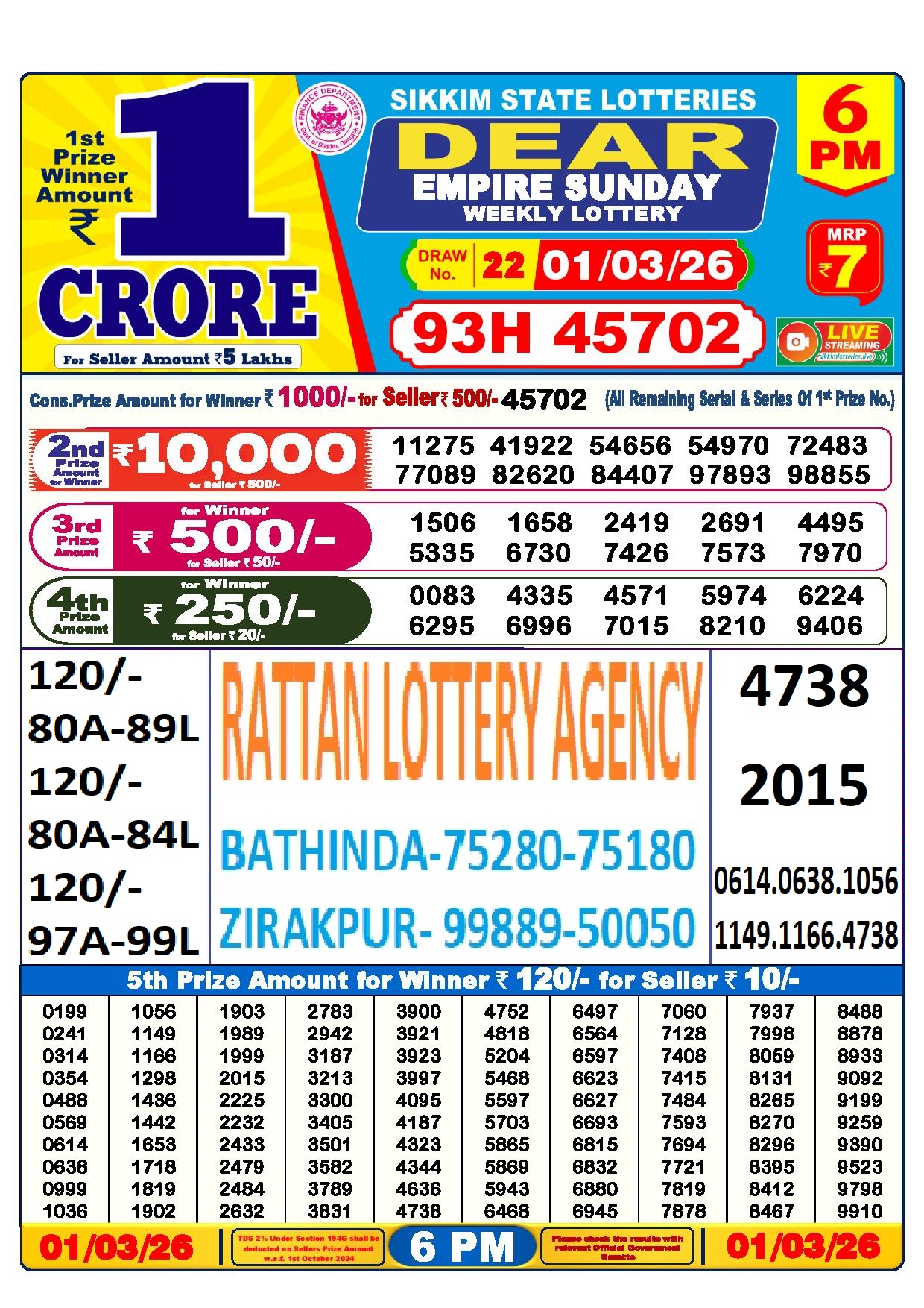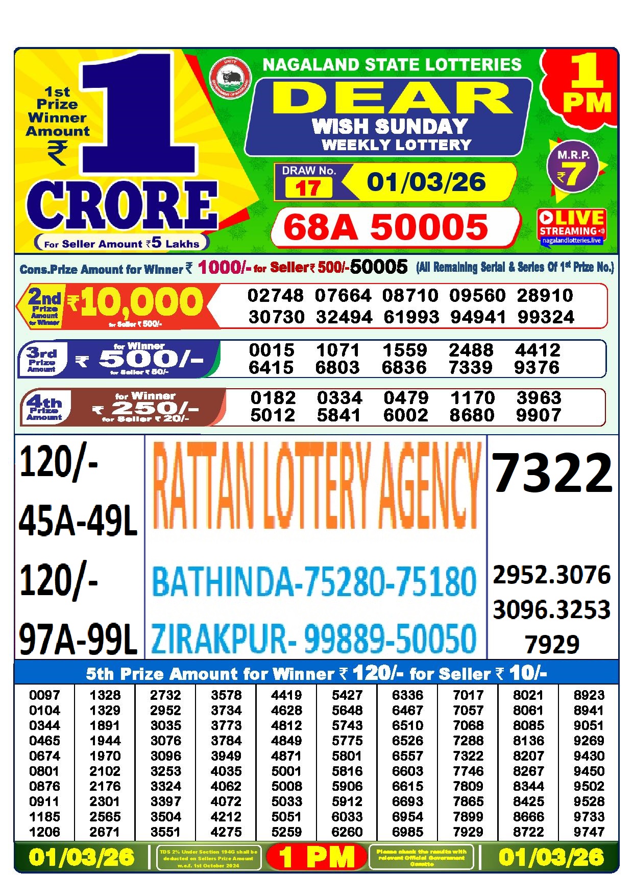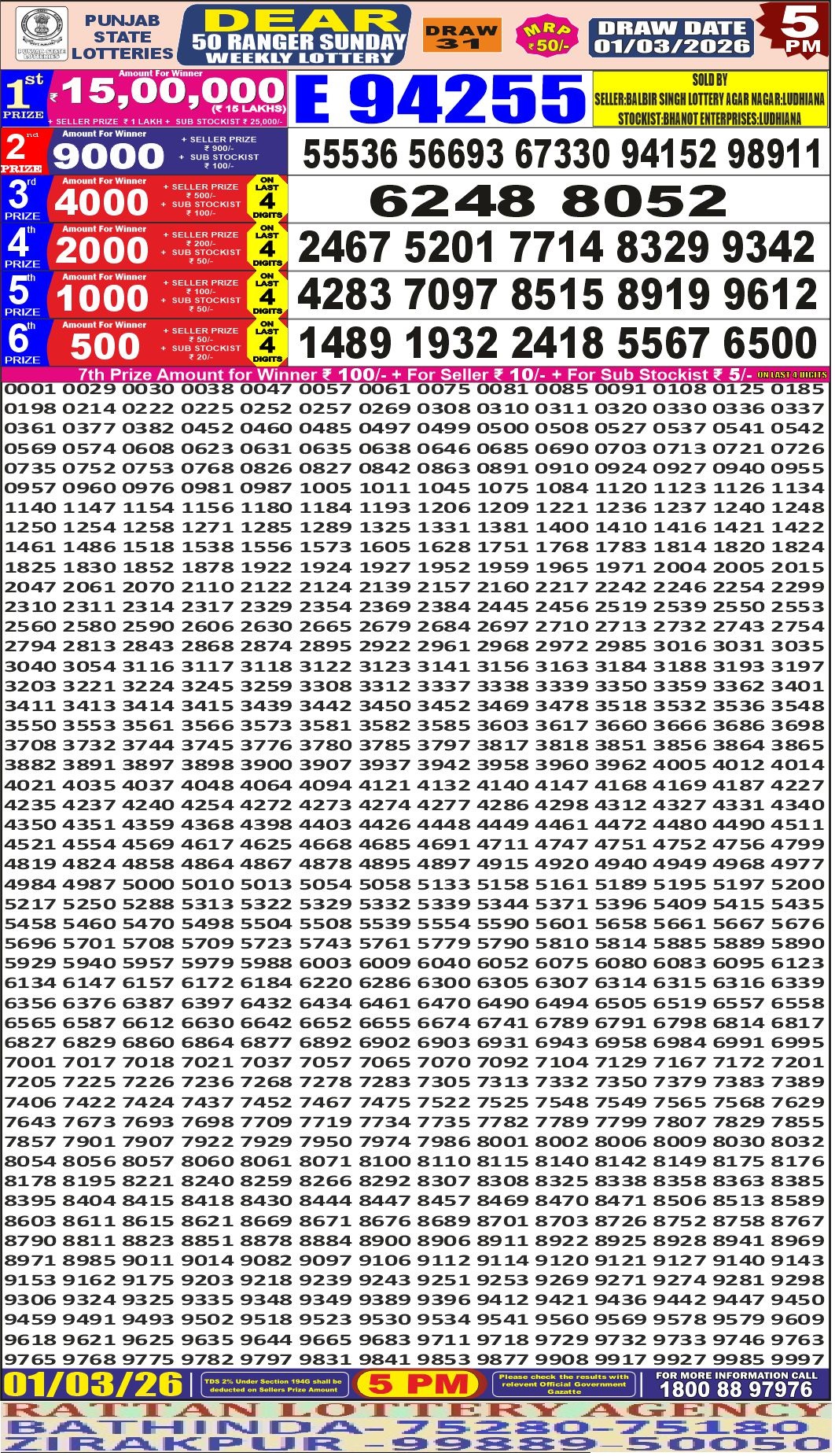RESULT DEAR 50 RANGER SUNDAY WEEKLY LOTTERY 01.03.2026