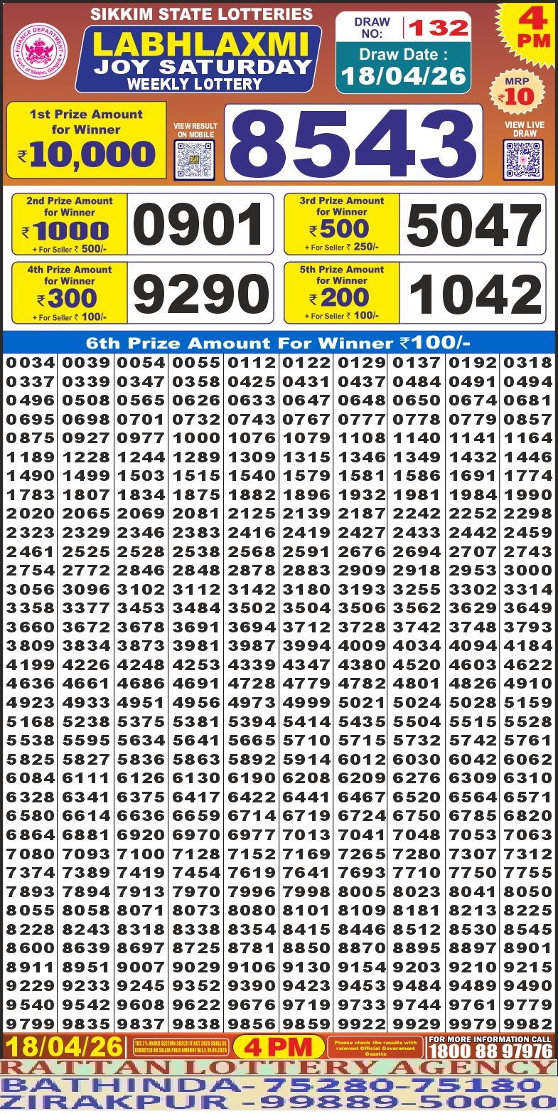 RESULT LABHLAXMI JOY SATURDAY WEEKLY LOTTERY 18.04.2026